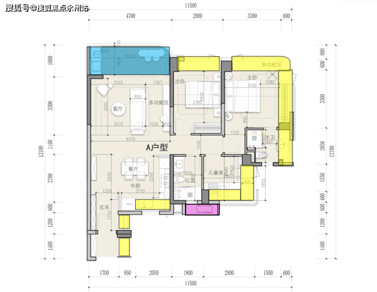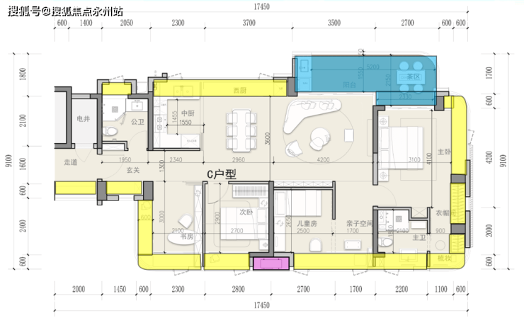 阔绰到4个房间,实用面宽最小的卧室也有约2.8米,儿童房则达到了夸张的约4.4米,可以分隔成休息区+亲子娱乐区,非常灵动。
