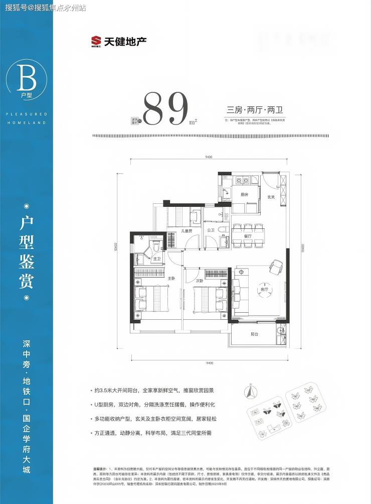 89㎡的3房2厅2卫,设计的是经典竖厅格局,进门入户玄关,客厅3.5米开间,三开间朝南,U型厨房,公卫三段式分离,得房率82%(不含赠送),西南或东南朝向。