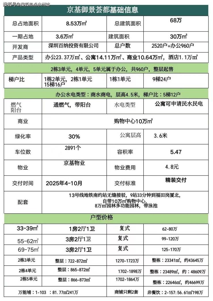 京基御景荟都分三期开发,一期是由4栋总层42-44层的公寓和3栋办公组成,一期建面30万㎡,二期三期是由学校,酒店,办公,公寓组成。目前在售一期产品。临近地铁14号线宝荷站(在建),总占地8.53万㎡,总建筑面积约68万㎡,规划有2520套公寓,960套办公。_Vip Tel:400-992-0669 中介勿扰