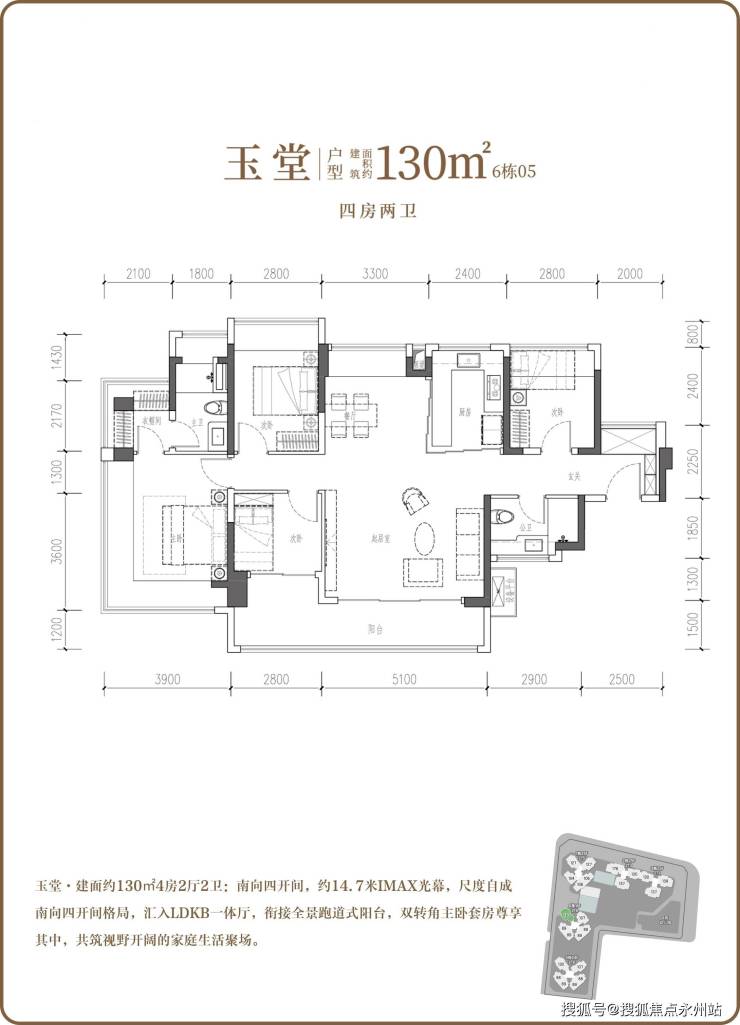 建面约130㎡四房两厅两卫:是首批推出的最大户型,在127㎡户型基础上进一步优化
