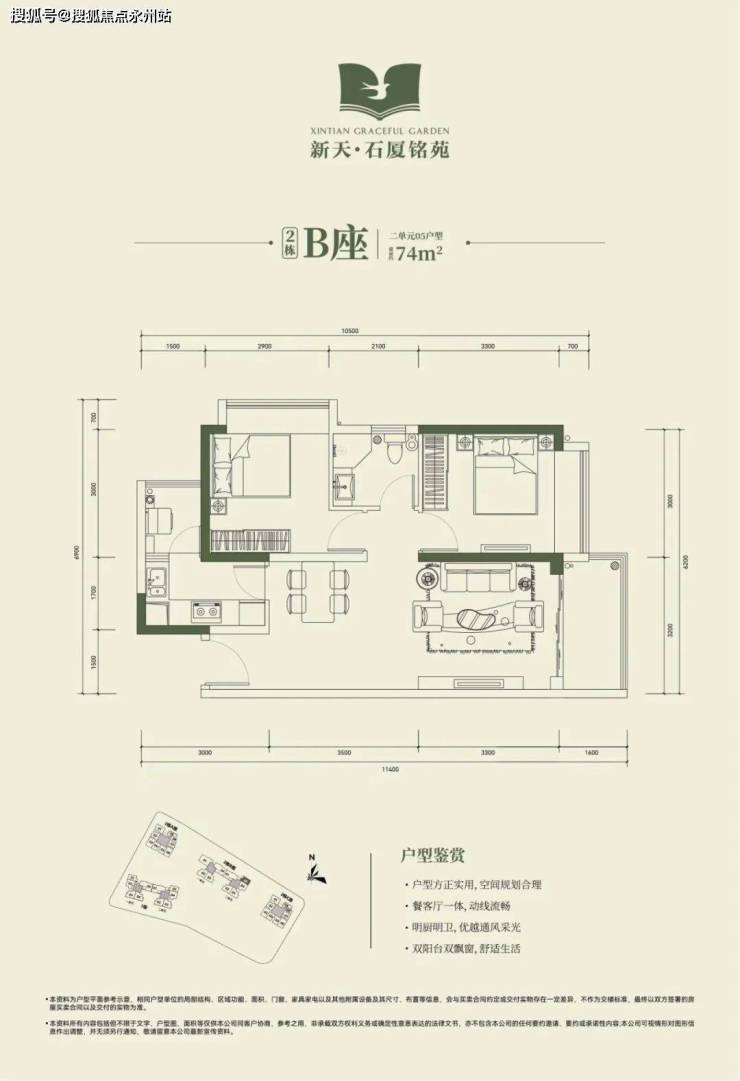 2栋B座二单元04、05户型:面积约为72-74㎡的2房2厅1卫。