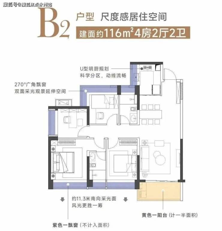 建面116㎡4房2厅2卫B2户型:竖厅设计,空间平衡性好。小次卧采用L型飘窗设计,采光和视野更佳。U型明厨规划科学分区动线流畅。