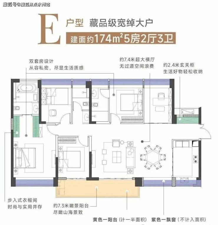 建面174㎡5房3卫E户型:经典的竖厅格局动静分离。五房三卫设计满足大家庭居住需求。约7.4米超大横厅和7.3米瞰景大阳台打造舒适居住空间。