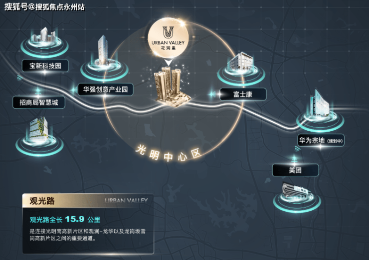 观光路,作为连通光明、观澜、大浪的核心主干道,沿途布局华强创意产业园、华润苹果小镇及富士康、华为、美团等具有世界级影响力企业,承载上下游产业智能化高端化发展红利,成就区域价值高地,未来堪称深圳北部深南大道。