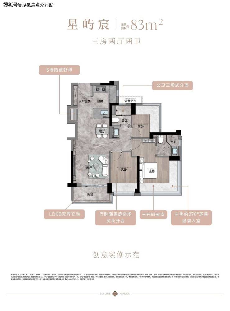 得房率:不含赠送得房率77.15%,但通过飘窗、设备平台等赠送面积,实际使用面积达83㎡,实现100%得房率。