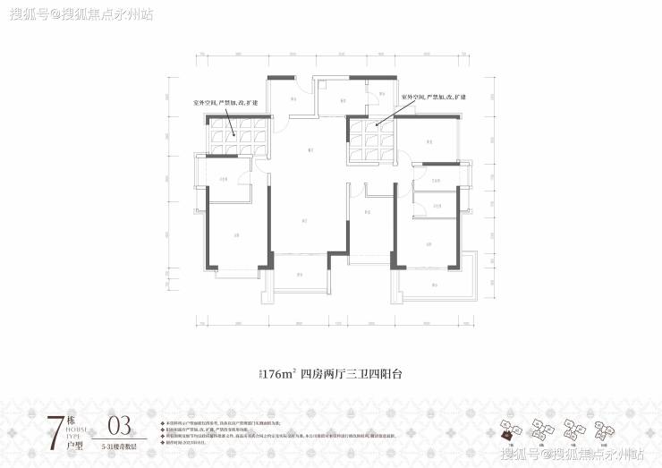 约176㎡四房两卫(7栋03户型)双龙抱珠格局,西南朝向;奇数层客厅、主卧、厨房配有阳台,偶数层主卧、次卧、厨房配有阳台