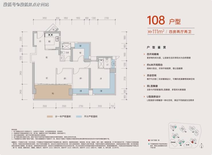 人性化细节:U 型厨房配S墙设计,预留双开门冰箱位;卫生间干湿分离,主卧套间带独立卫浴及衣帽间;全屋11-12面飘窗环绕,采光通风俱佳。
