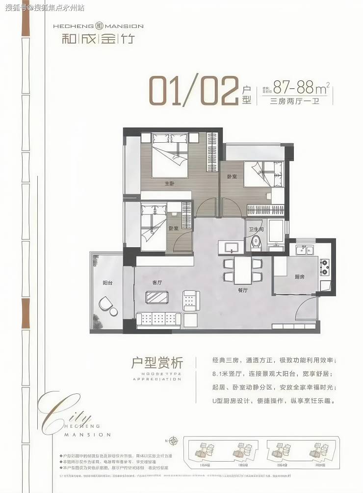 精制3房 甄选一线知名品牌:约88-99㎡精制3房,考究空间布局,户户方正实用;入户、起居、厨房、卫浴、收纳等五大精装系统,优选国内外知名品牌,大手笔配置,为城市精英营造极具品质感的美好生活方式