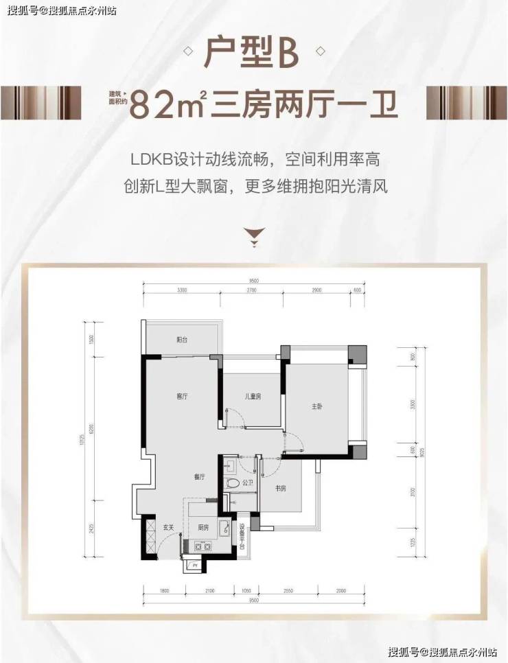 82㎡的3房2厅1卫(户型B),设计的是经典竖厅格局,进门入户玄关,客厅3.3米开间,LDKB一体化设计,动静分区,3个卧室分别做到了3.5米/2.7米/2.55米的宽度,主卧加1个次卧270°飘窗设计,U型厨房,得房率:77.5%(不含赠送),全部东北朝向。