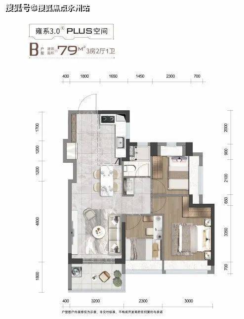 建面约79㎡3房2厅1卫相当于市面85-87㎡户型,性价比更高。L型厨房+预留冰箱位,LDK设计让空间尺度阔绰大气。