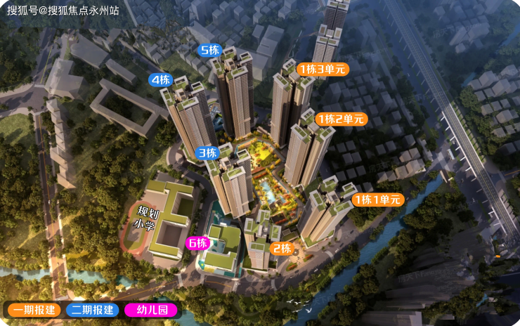 项目分两期建设开发,一期由4座48层高住宅楼和1座3层高12班幼儿园教学楼组成,小区大门、老年人间照料中心、社康中心、公交首末站、文化活动室等基础配套均在本期报建范围内。