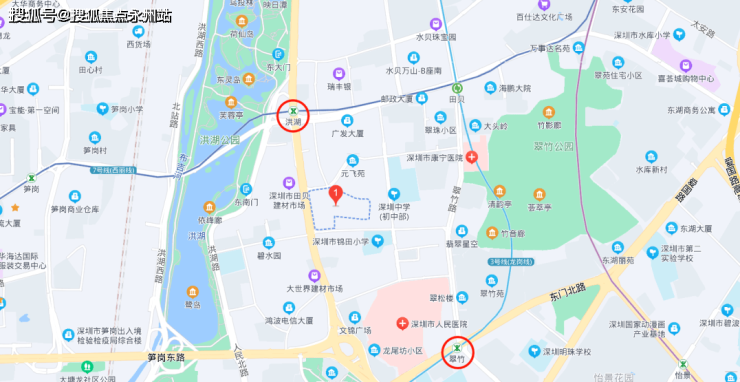 地铁轨道交通方面,项目临近地铁7号线洪湖站、3号线翠竹站。距离最近的洪湖站仅有300多米,翠竹站距离约1公里。路网交通方面,项目通过三横三纵交通格局,可快速通达全市各大主区;城际交通方面,罗湖火车站和谐号贯通广深,并且清水河已规划建设高铁站,未来将会形成南北高铁枢纽格局。