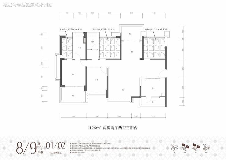 约126㎡二房两卫(8/9栋01/02户型)双龙抱珠格局,南北通透;奇数层客厅、厨房配有阳台,偶数层餐厅、主卧、厨房配有阳台,奇偶层都需要改造进门右手边、餐厅与公卫之间镂空地方,获取两个房间。