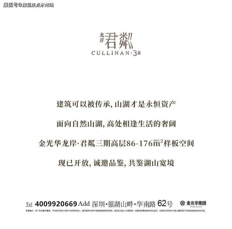 【金光华 龙岸 君粼】深圳市最高使用率之一墅区大盘,占地10万平米醇熟大社区,容积率仅1.99,约20万㎡城市别墅湖景宽宅。预计推售465套住宅,建面约86㎡-176㎡3房-6房。