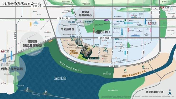 「政策倾斜 见未来」超300亿大金沙规划唯一接驳福田CBD和深圳湾的滨海新城,北邻香蜜湖新金融中心和车公庙2049未来之城,南接河套深港科创合作区,以政府资源的倾斜和前瞻的规划,成为最具生长力片区,主推福田CAZ转型。