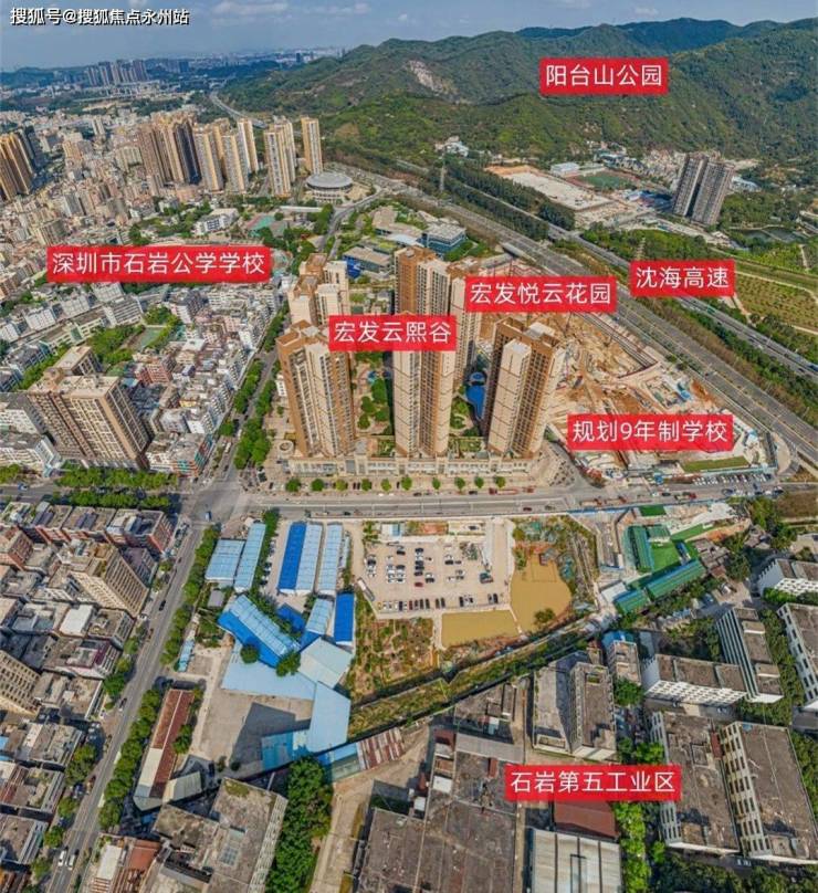 项目北侧就是一期宏发云熙谷,深圳市石岩公学学校,西侧是石岩第五工业区,往前走700米就是13号地铁线“罗租站”,东侧是石岩文化艺术中心,南侧是沈海高速,石岩农业生态园,东南侧是阳台山森林公园。(深圳宏发悦云花园售楼处电话:400-992-0669)