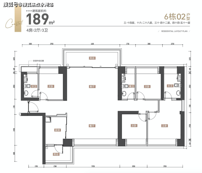 6栋:01户型142平4房2卫,02-03户型188平4房3卫,为楼王单位,层高3.15米,3梯3户。