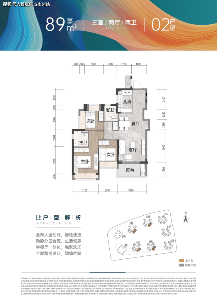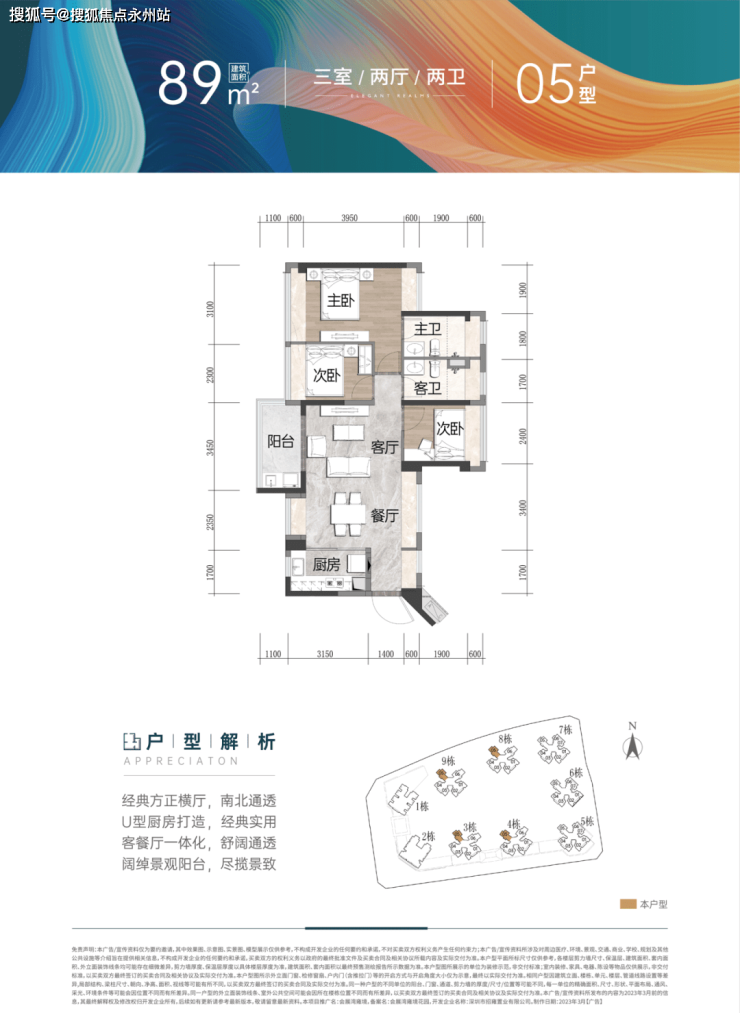 建面约89/90㎡ 3房2厅2卫(竖厅):南北通透3房,全凸窗设计,动静分区合理