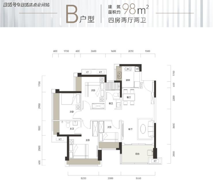 建面98平的4房,是市面上很难得的百平米以内的4房户型,也可以看做是89平3房的升级版。