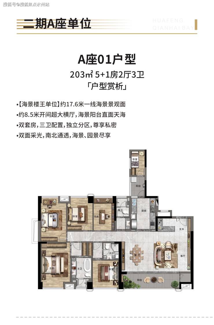 203㎡ 5+1室2厅3卫:双套房设计,主卧带270° 转角飘窗,享无遮挡海景,多功能房可灵活改造为书房或儿童活动区,满足家庭成长需求。