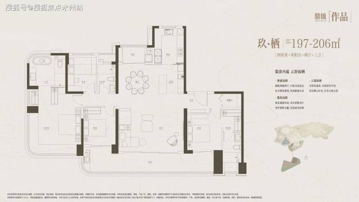 197㎡大平层:单价4.93-6.39万/㎡,总价973-1262万,专梯专户设计,南北双阳台,北向观山、南向瞰城。