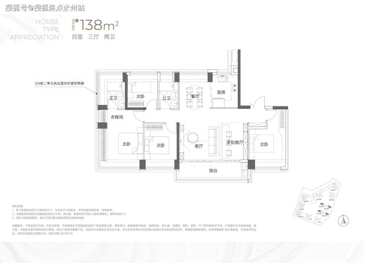 113㎡4房2卫-竖庭格局,西南向,基本居住功能与建面约108-110㎡4房2卫一致,但格局不一样,从目前公布的户型图上看,主要是主卧空间有了更大的提升,比如可以放更大一点的衣柜。