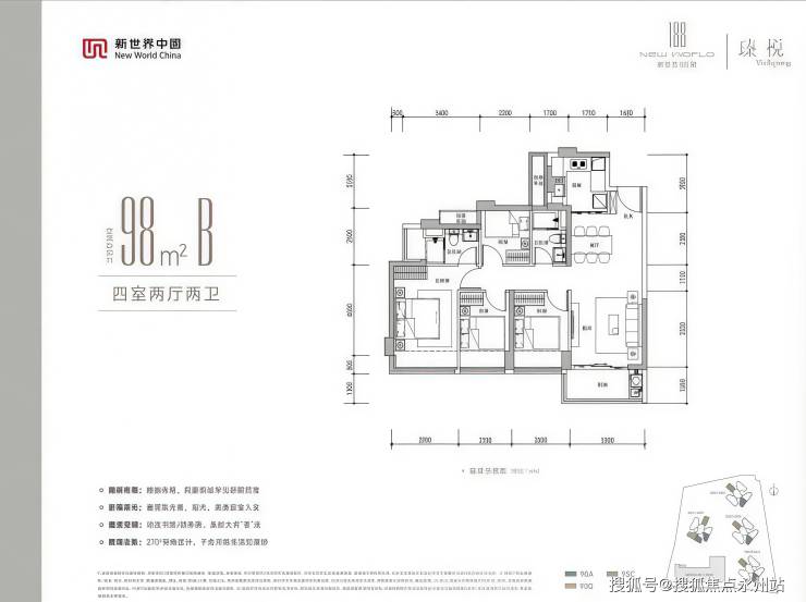98㎡4房2厅2卫(A/B/C户型)三款户型均实现98㎡四房布局,无面积浪费,适配多孩家庭或三代同堂居住需求,U型厨房、公卫三段式干湿分离、主卧套房+270°飘窗为共同亮点:
