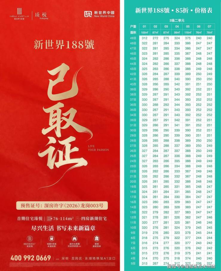 最新信息!龙岗新世界188号(备案名:新璟曜广场,推广名:新世界188号·瑧悦)已取证,首推05地块「瑧悦」属于项目首期面市产品,涵盖4栋超高层住宅(3栋一单元45层,其余三单元49层)预计2028年6月30日精装交付,目前营销中心及样板房已开放,参观需提前预约。Vip Tel:400-992-0669【官方热线】