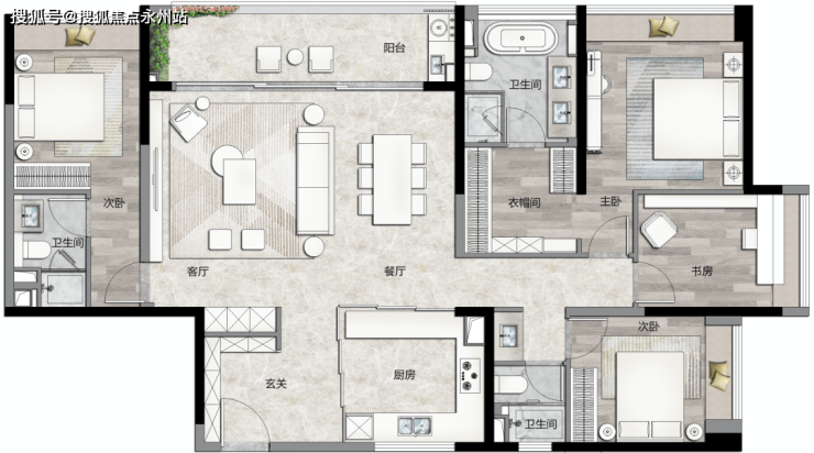 约170㎡户型,结构上实现了3个带独立卫生间的完整居住空间,就算是三代同堂,也能互不干扰。