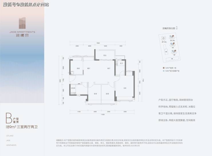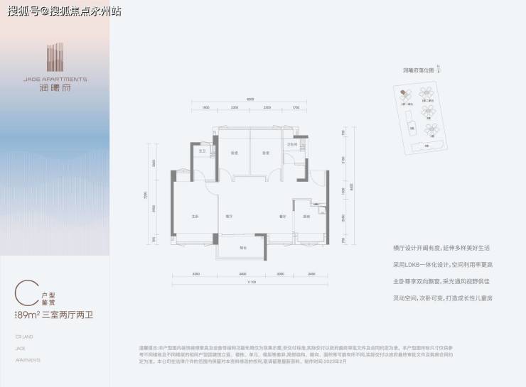 89㎡的3房2厅2卫,B户型(1栋2单元/2栋/3栋的03.04),设计的是横厅南北通透格局,客餐厅6.45米开间,LDKB一体化,3个卧室分别做到了3.3米/2.35米/2.3米的宽度,U型厨房,公卫三段式分离,得房率:80.44%(不含赠送),阳台主朝西北或东北向。