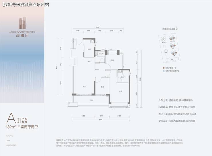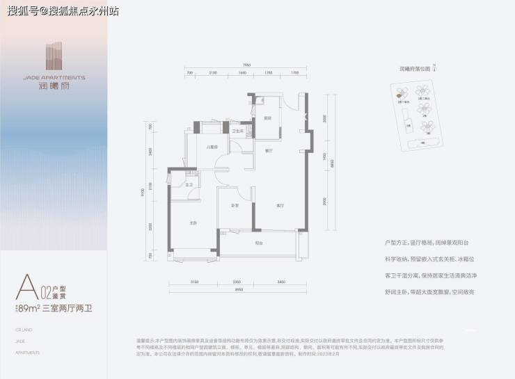 89㎡的3房2厅2卫,A02户型(1栋1单元的03),设计的是经典竖厅格局,客厅3.45米开间,LDKB一体化,S墙设计预留冰箱卡槽位,3个卧室分别做到了3.15米/2.4米/2.35米的宽度,U型厨房,公卫三段式分离,得房率:80.44%(不含赠送),阳台朝西南向。