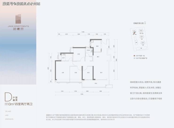 110㎡的4房2厅2卫,D户型(1栋1单元的01.02),设计的是经典竖厅格局,客厅3.5米开间,LDKB一体化,S墙设计预留冰箱卡槽位,4个卧室分别做到了3.15米/2.75米/2.68米/2.4米的宽度,客厅连接次卧出5.9米长的大阳台,U型厨房,公卫三段式分离,得房率:80.45%(不含赠送),阳台朝东南向。