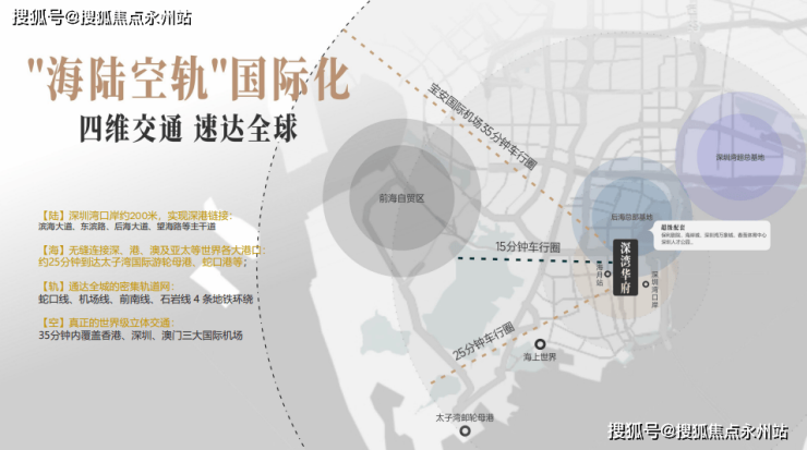 片区依托三纵四横道路交通及深圳湾关口约200米,实现深港链接;25分钟可达香港中环、香港国际机场;并且依托沿江高速可快速到达广州、珠三角等地。