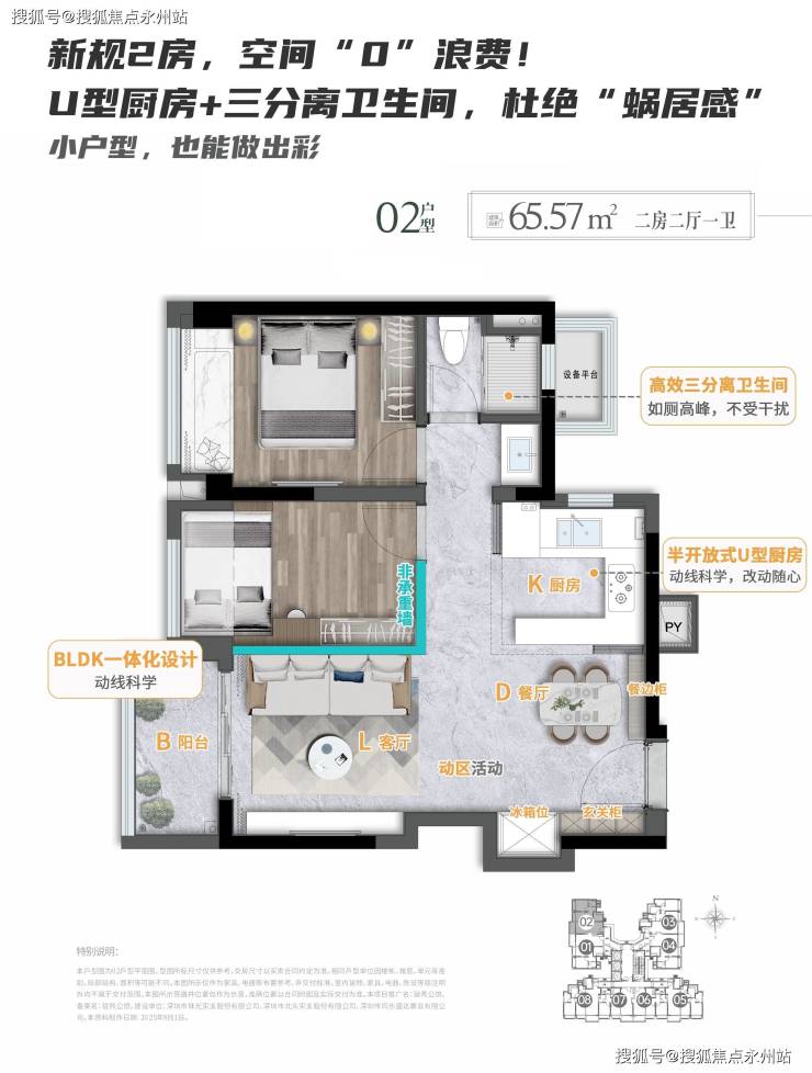 高得房率:新规设计下,得房率达88-91%,显著高于传统户型。例如,65㎡户型实用面积接近70㎡传统户型水平。