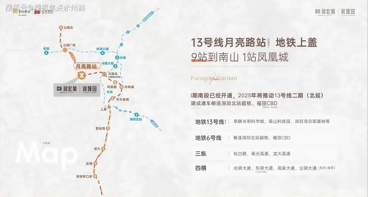 项目距地铁13 号线月亮路站(建设中)直线距离仅约600米,目前地铁一期北段已进入调试阶段,年内即将通车,月亮路站所在的二期北延段,在2025年光明区政府工作报告也明确全力推动今年底前建成通车。