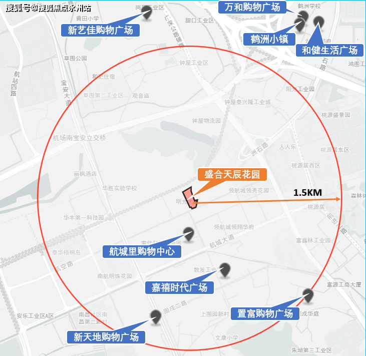 除自带商业和临近商业外,项目1.5公里范围内还分布有嘉禧时代广场、新天地购物广场、置富购物广场等集中式商业。不过,这些商业基本都集中在项目南侧方向,距离项目距离稍远,如要享受这里的商业配套需要借助交通工具。