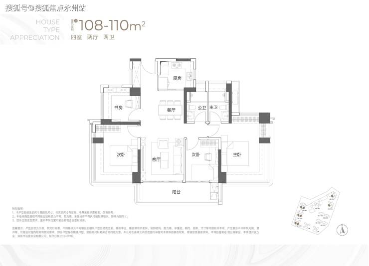 108-110㎡的4房2厅2卫,设计的是竖厅双龙抱珠格局,进门独立入户,客厅3.5米开间,LDKB一体化,4个卧室分别做到了主卧18.05㎡/次卧14.5㎡/次卧8.45㎡/次卧7.5㎡(包含墙体飘窗),主卧加2个次卧270°全景飘窗,客厅连接次卧出6.1米长的大阳台,U型厨房,得房率约95-97%(包含赠送),西南或东南朝向。