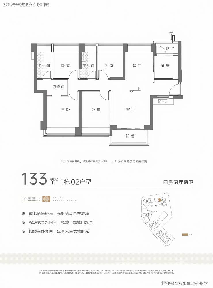 133㎡四房两厅两卫:南北通透竖厅,三开间朝南,主卧套间,U 型厨房带生活阳台,客厅阳台主朝西南向,得房率约 74.8%。