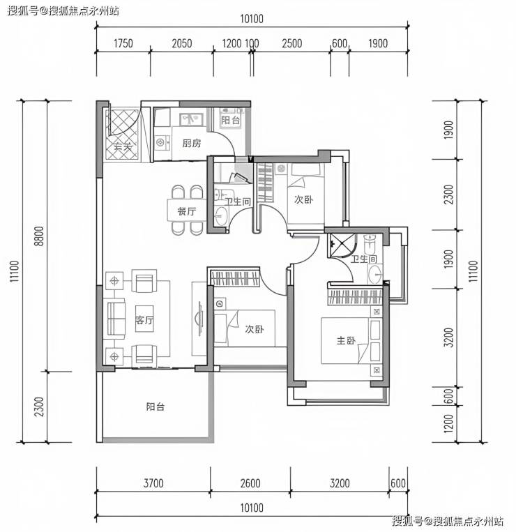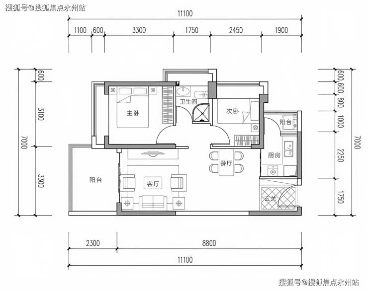 设计亮点:主次卧均朝南,互不干扰;双阳台设计,生活阳台(2.3m×3.3m)景观阳台分区,采用干湿分离卫生间,L型厨房布局,全明采光。