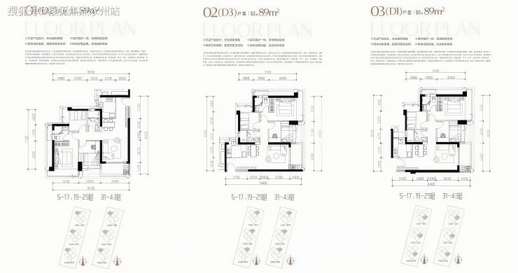 只有D户型有两条腿,其余户型都是一条腿;D户型朝西南,D2户型也朝西南,D1和D3朝东南。整体上89平的4个户型差异都不大,都是竖厅,总体来说有3处细微的区别(可以对着标准层看)