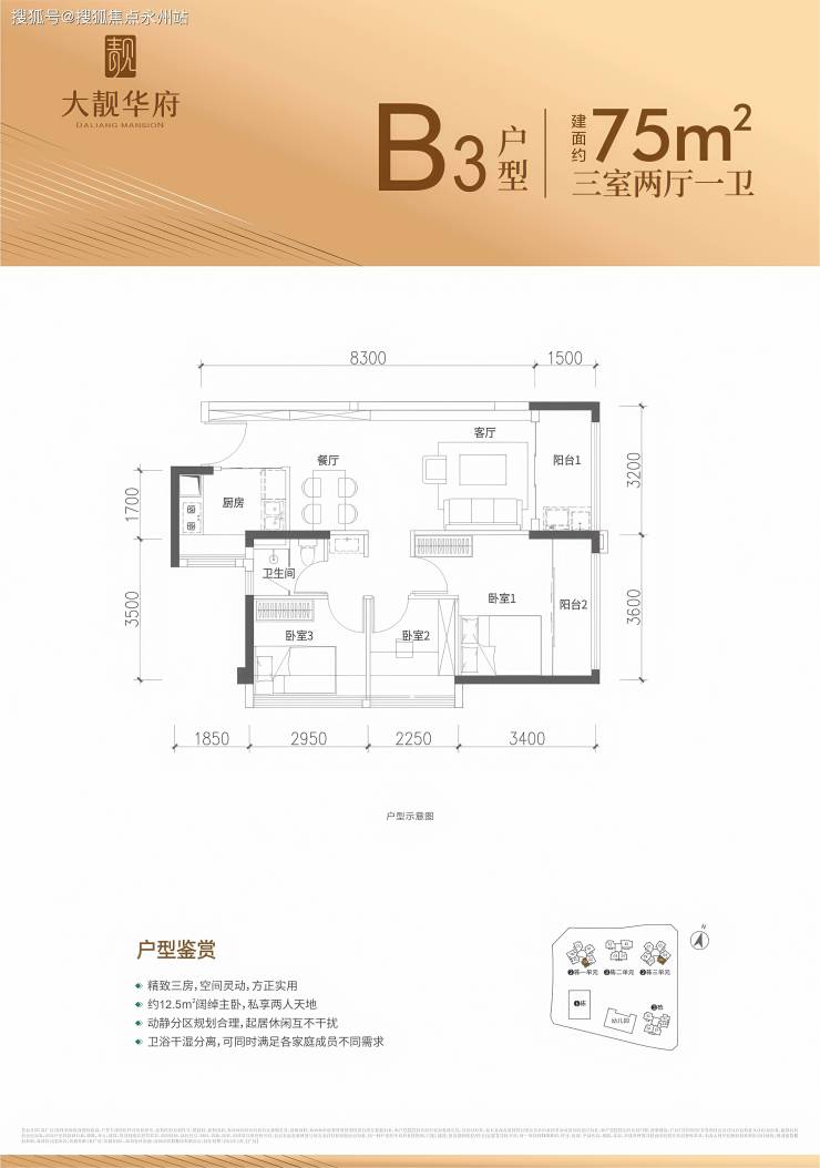 75㎡3房2厅1卫东南向:得房率91%,主卧面积(含飘窗)13.06㎡三段式卫生间、三开间朝南。