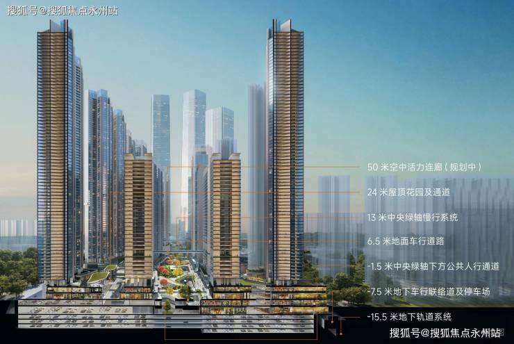立体之城七重立体交通:创新打造地上地下七重结构立体化交通系统,不同交通系统分层互联,人行系统、城市公共道路系统、地下轨交系统快速接驳,最大程度实现人车分流,科学化疏解交通压力。