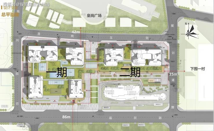 其中一期占地面积为31428.9㎡,计容建筑面积174082.2㎡,容积率5.54,共五个单元塔楼,其中一至四单元为回迁住宅,总面积101500㎡,五单元为一期唯一可售住宅,总建筑面积30807.64㎡,商业41503.6㎡,停车位1266辆。二期为三个单元可售住宅,住宅总建筑面积约7万/㎡。