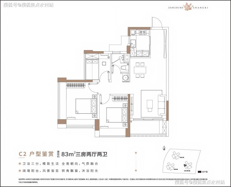 83㎡的3房2厅1卫,设计的是经典竖厅格局,客厅3.6米开间,LDKB一体化设计,进门入户玄关,三开间朝南,3个卧室分别做到3.5米/2.8米/2.35米的宽度,主卧270°转角飘窗,U型厨房,卫生间三段式分离,得房率:76.44%(不含赠送),阳台朝西南或东南向。