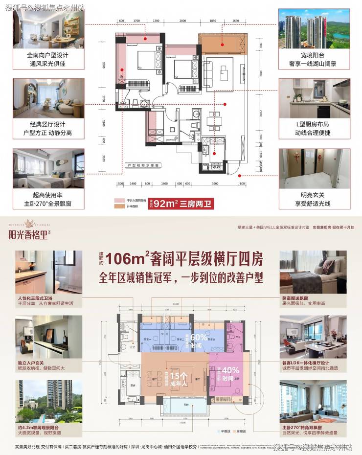采光与通风:所有户型均为明厨明卫,92㎡、106㎡户型实现三开间朝南,主卧带270° 转角飘窗,106㎡四房南北双阳台形成对流,夏季穿堂风可降低室内温度2-3℃。