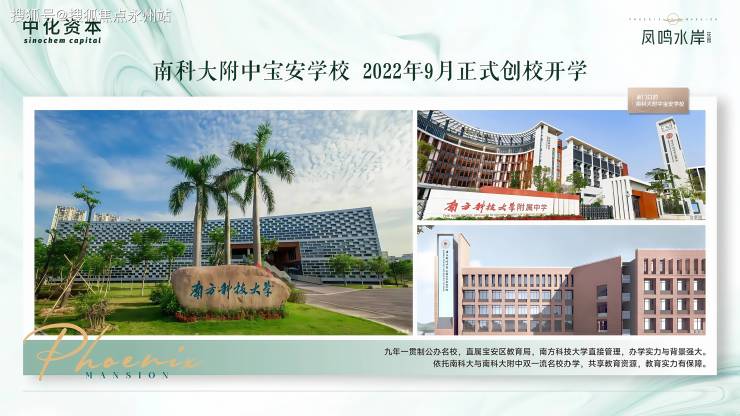 项目家楼下就是南方科技大学附属中学宝安学校,该校在2022年9月正式开办招生,是1所九年制公办学校,办学规模42个班,由全国知名中学优秀校长王佩东担任创校校长,同时全面共享南科大和南科大附中的学术教育资源,南科大院士、讲席教授、教授及各领域专家、南科大附中名师将深入学校授课。