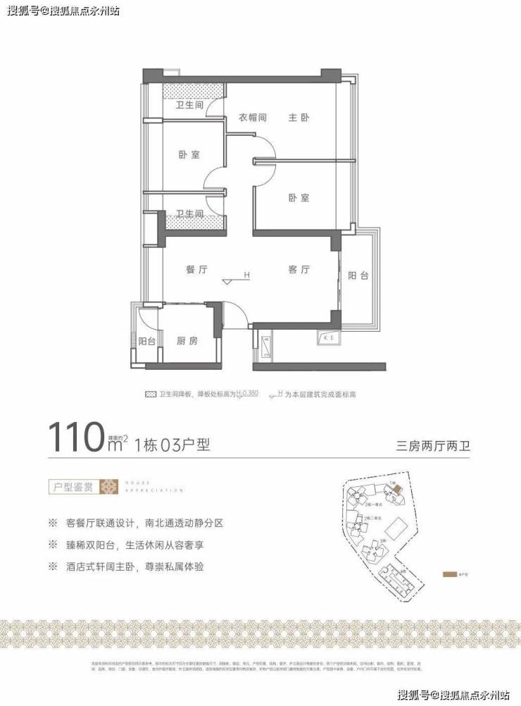 110㎡的3房2厅2卫,设计的是竖厅南北通透格局,三开间朝南,全屋飘窗设计,主卧大套间,U型厨房,还带1个小生活阳台,得房率约75%(不含赠送),客厅阳台主朝东南向。