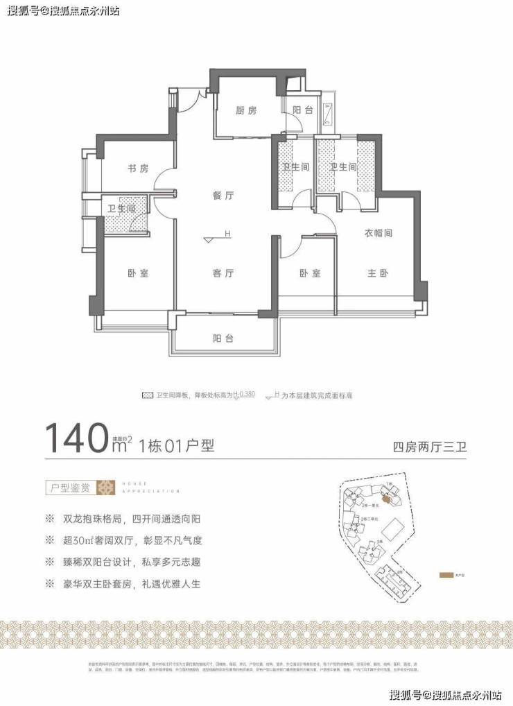 140㎡的4房2厅3卫,设计的是竖厅双龙抱珠格局,进门独立玄关,LDKB一体化设计,四开间朝南,双主卧套间,U型厨房,还带1个小生活阳台,得房率约75%(不含赠送),客厅阳台主朝西南向,看花园景观。