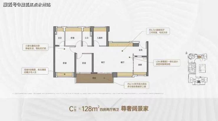 128㎡的4房2厅2卫,设计的是横厅南北通透格局,客餐厅6.5米开间,进门户玄关,LDKB一体化,客厅连接次卧出6.1米长的大阳台,主卧大套间设计,全屋8处飘窗,U型厨房,卫生间干湿分离,阳台主朝南向。