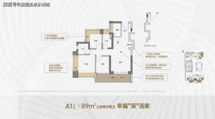 89㎡的3房2厅2卫,A1户型,设计的是竖厅格局,客厅3.5米开间,LDKB一体化,S墙设计预留冰箱卡槽位,客厅连接次卧出5.9米长的大阳台,主卧双面飘窗,次卧270度转角飘窗,U型厨房,卫生间干湿分离,阳台有朝西向、东向、南向。